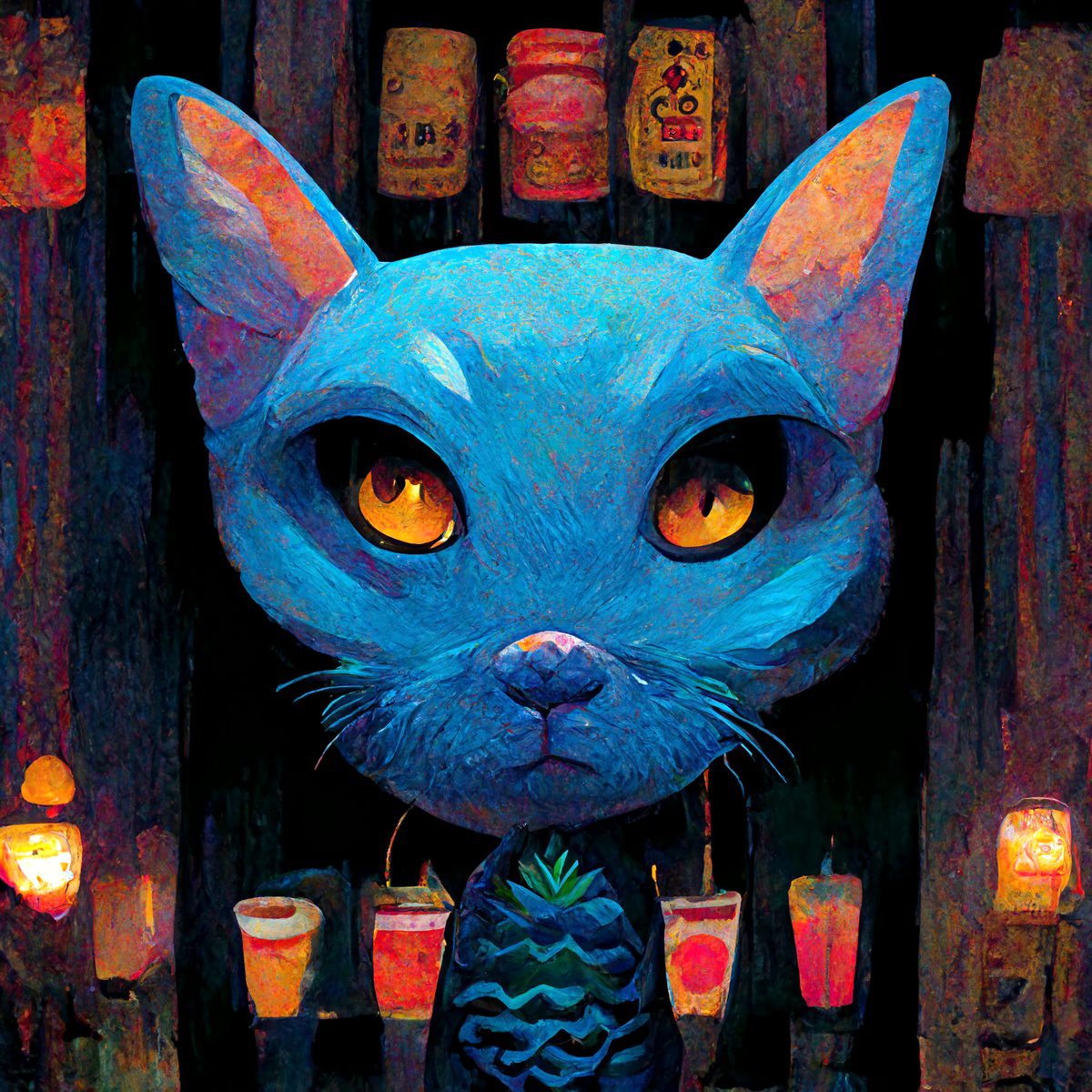 Blue Mysterious Cat With Large Head Sits In Dimly Lit Tiki Bar