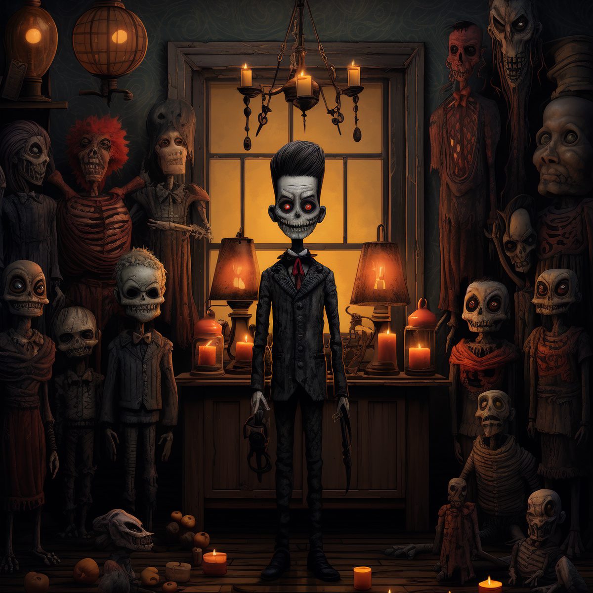 Stepping into the realm of the mysterious, this Jacob’s Life In Vegas spooky design invites you into a dimly lit room where a skeletal soirée is in seemingly in full swing. Amidst the bony crowd, one dapper skeleton, suited up and ready to party, stands staring at you. But wait, is that a candlelit dance party or a macabre meeting?