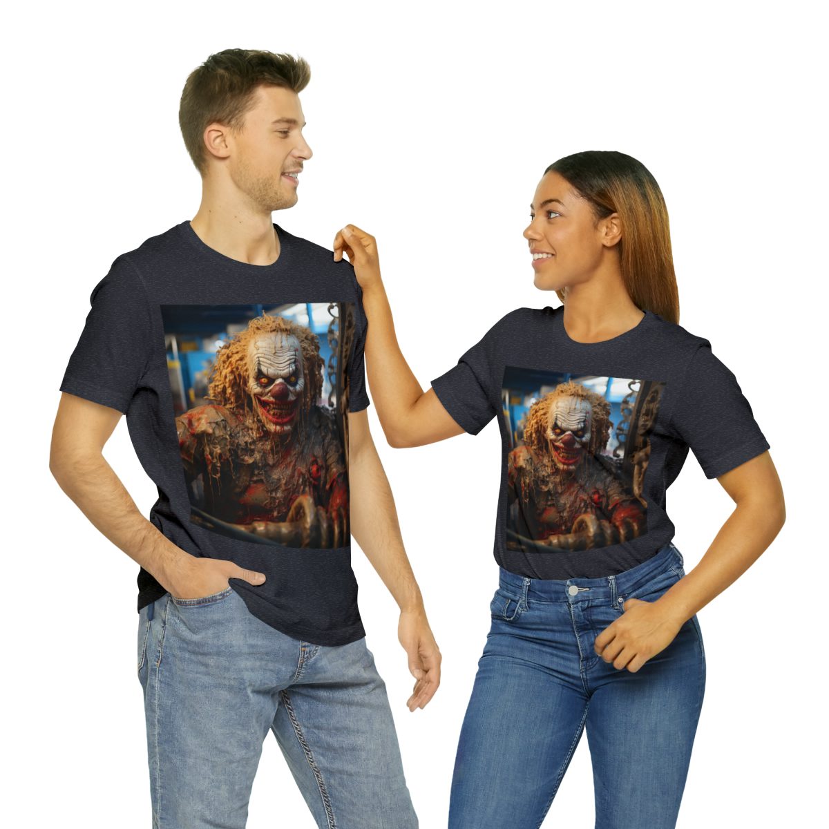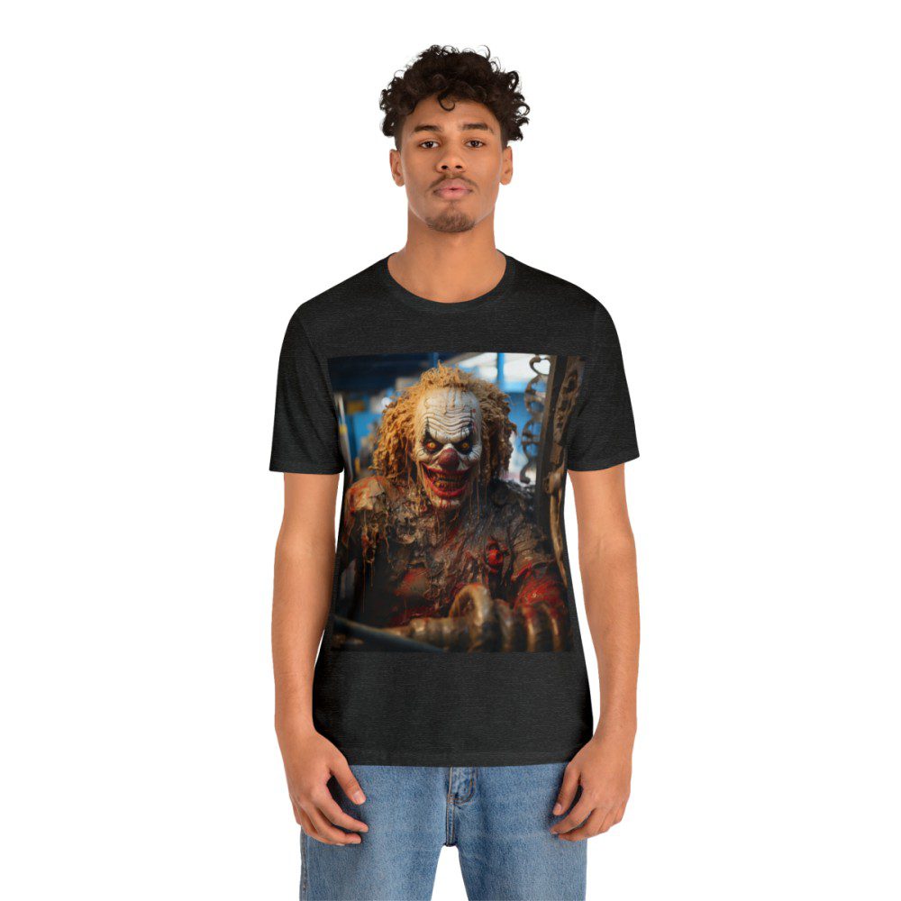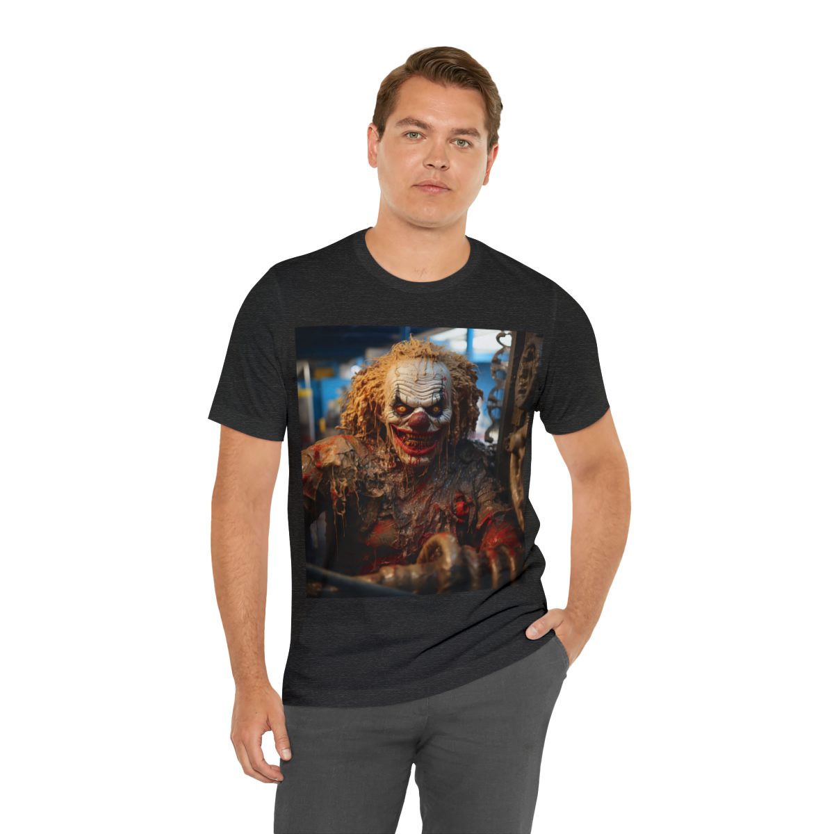 This clown definitely isn’t part of a circus! He’s a dirty, smelly renegade, and staring at him as he stares at you, you’re not quite certain whether a person is under the mask or if it’s just some sinister statue. — You’ll be creeping out everyone everywhere you wear this shirt!