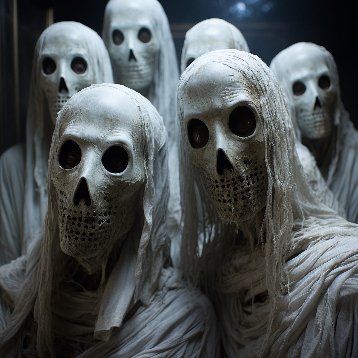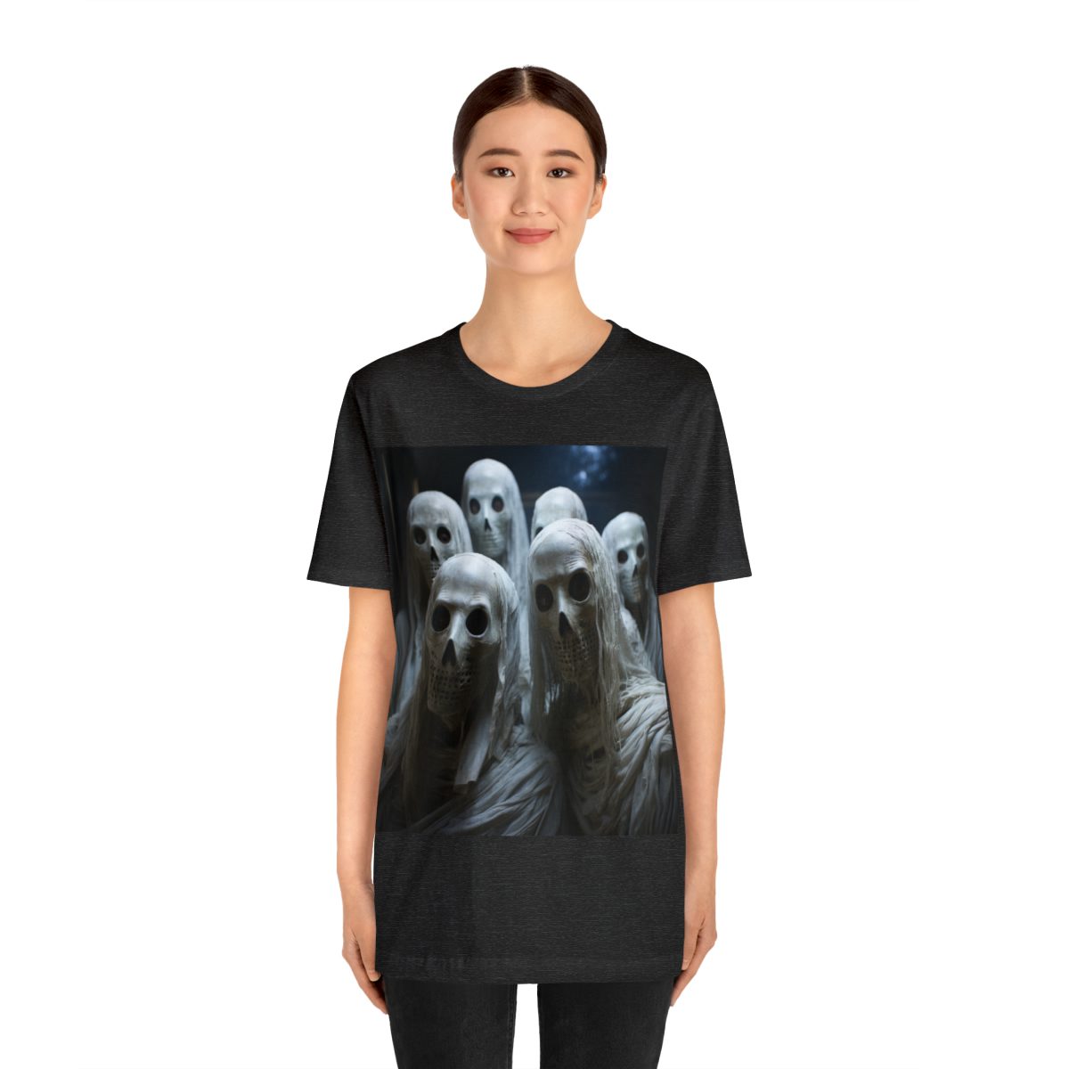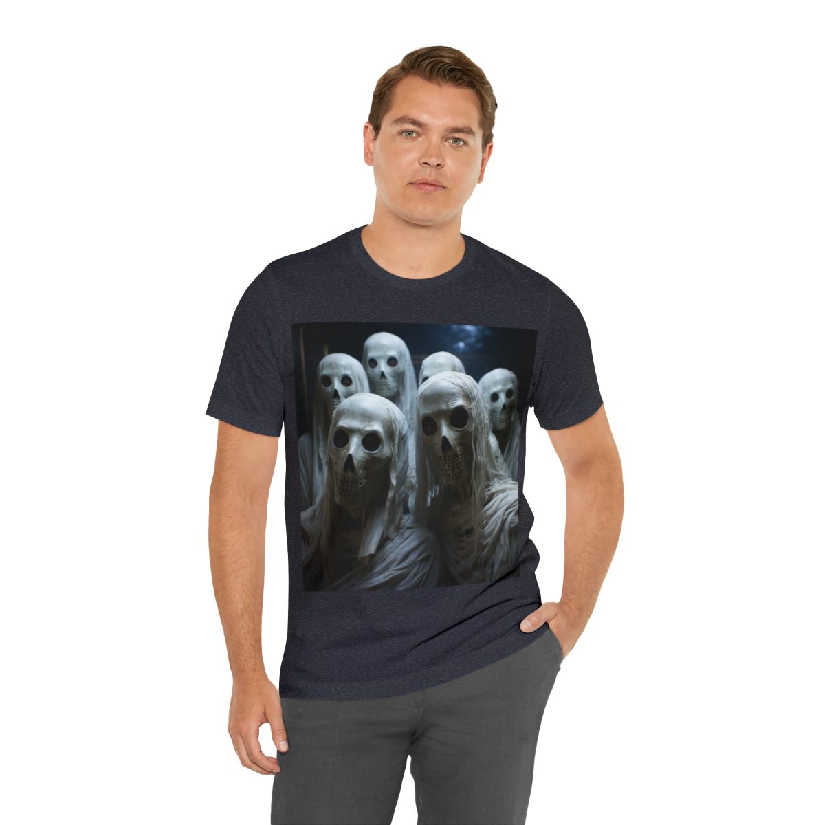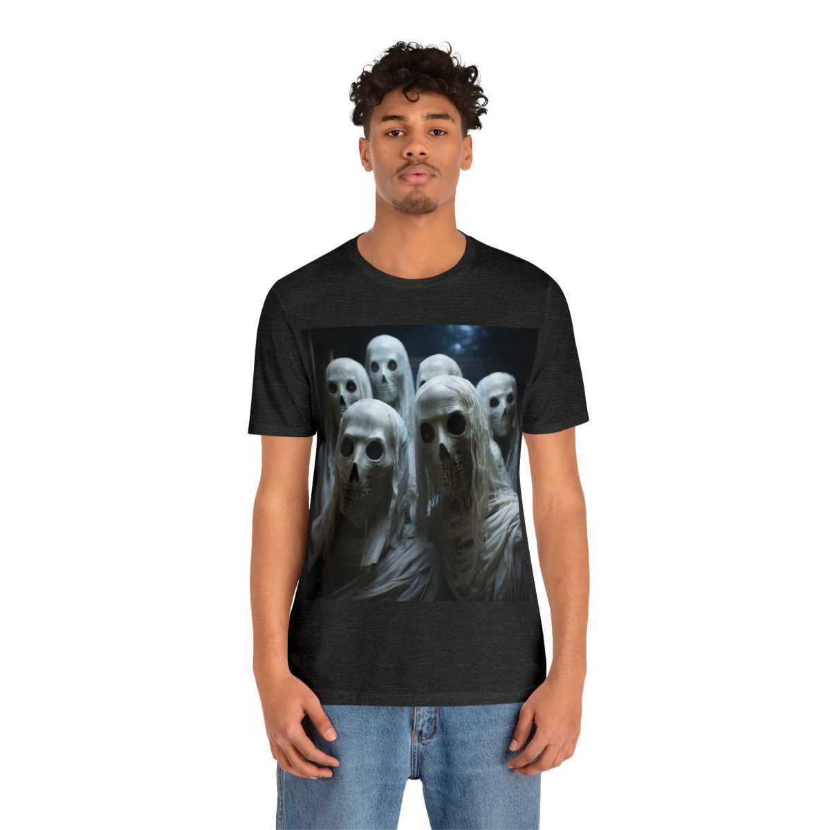 Step into a realm of mystery and intrigue with this captivating collection of ethereal skeleton-men draped in flowing robes. As the masked figures beckon you closer, their secrets remain hidden behind their white masks. — With this shirt, you’re not just wearing an image; you’re donning a tale of the unknown, inviting everyone you meet to unravel the mystery… and to be a bit scared with you, too!