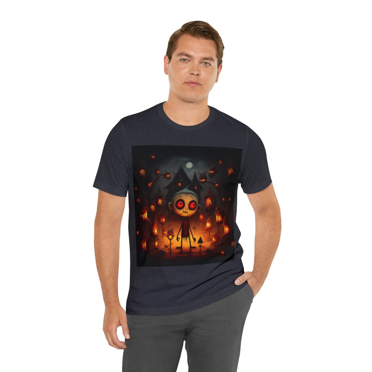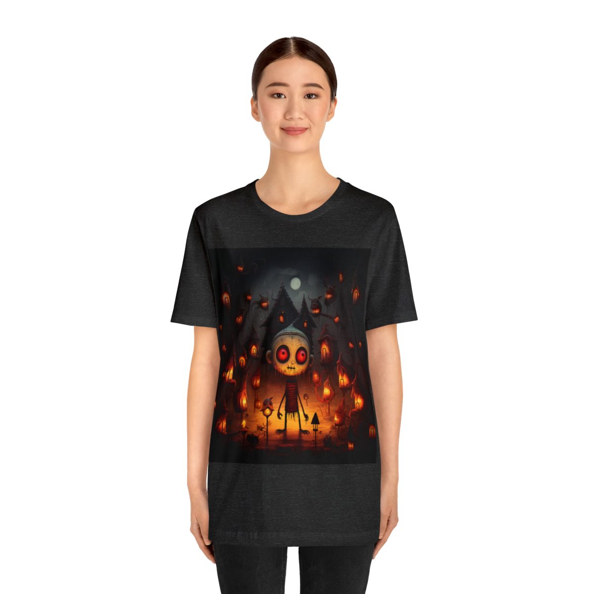 This adorable, little guy seems a bit spooked to be out at night amongst the many gnome houses that are watching him. A few bat-birds in the treetops are also contemplating what he’s up to, too!