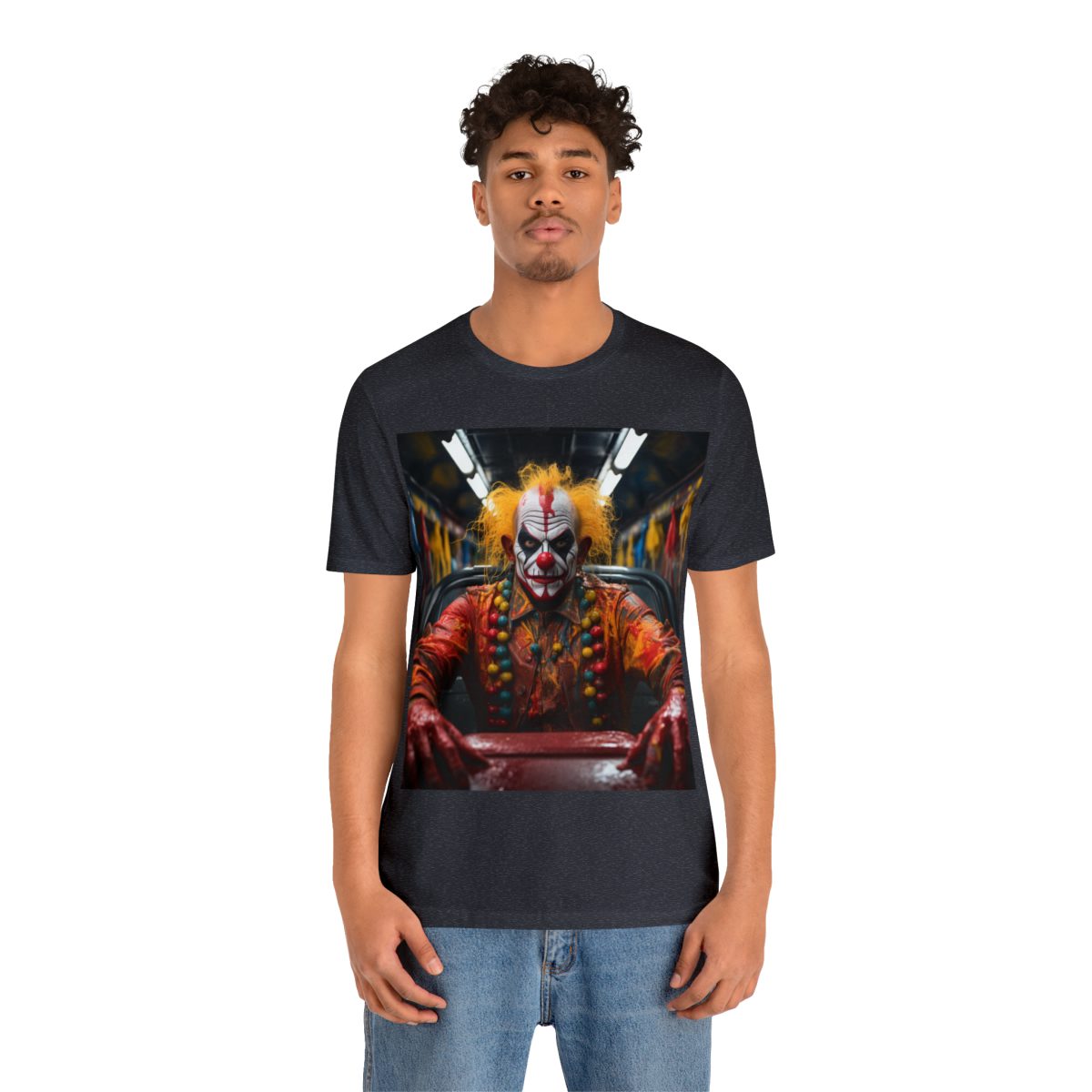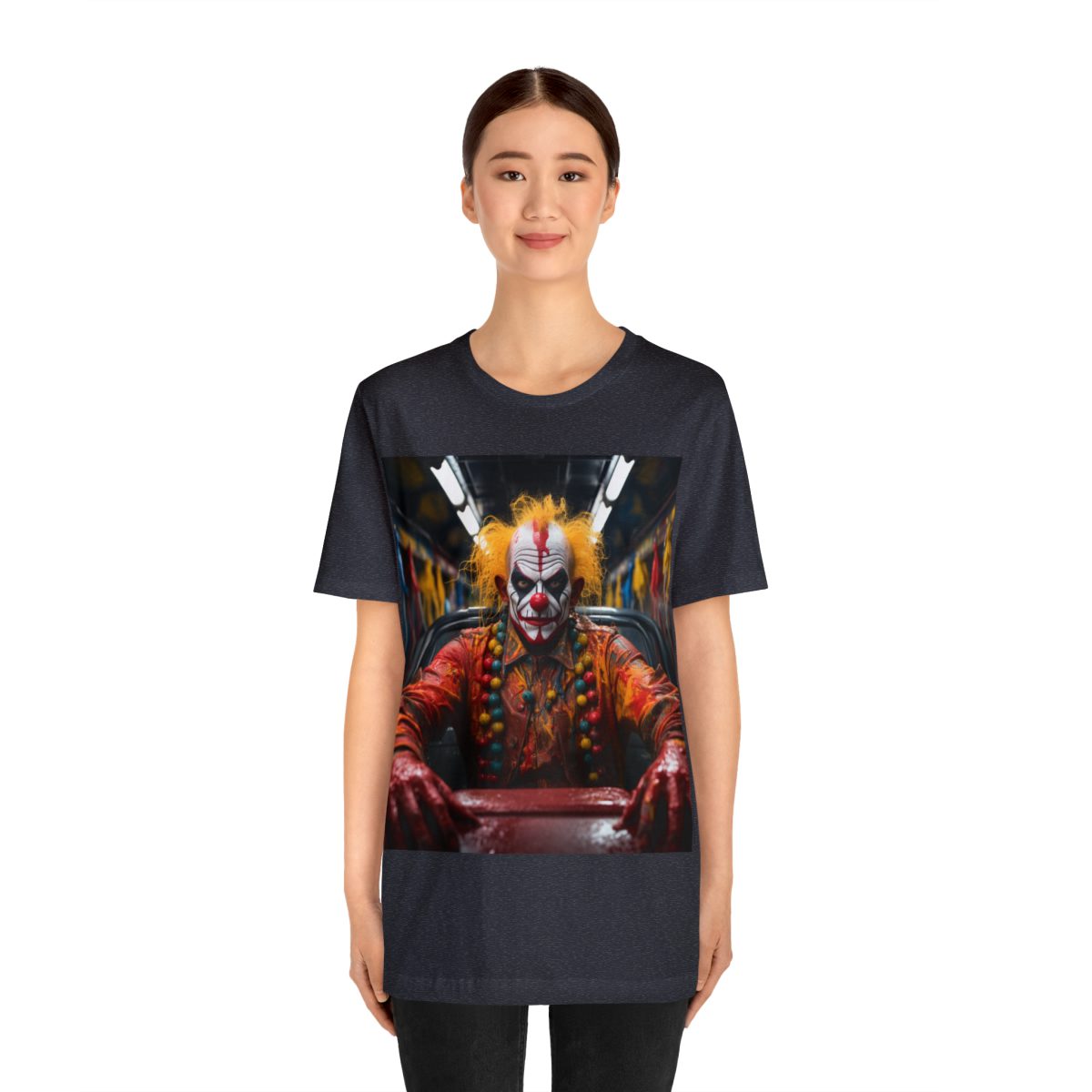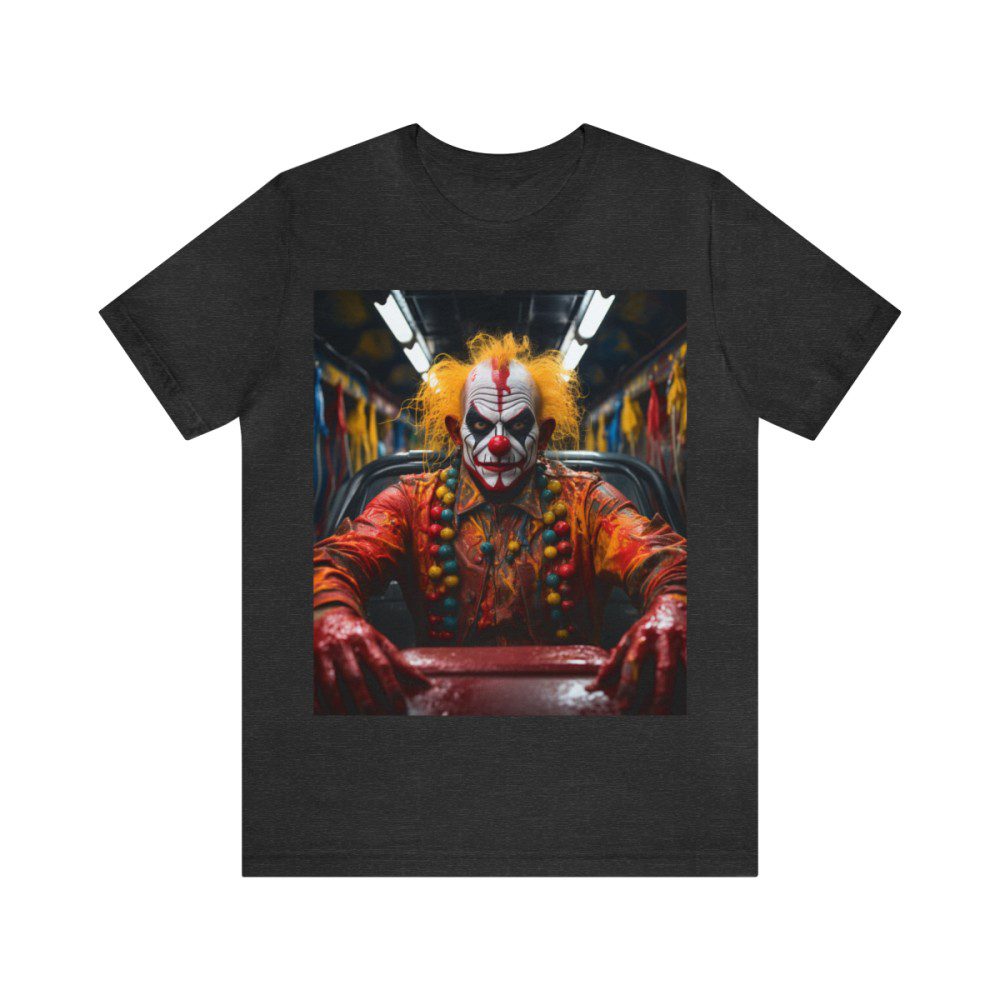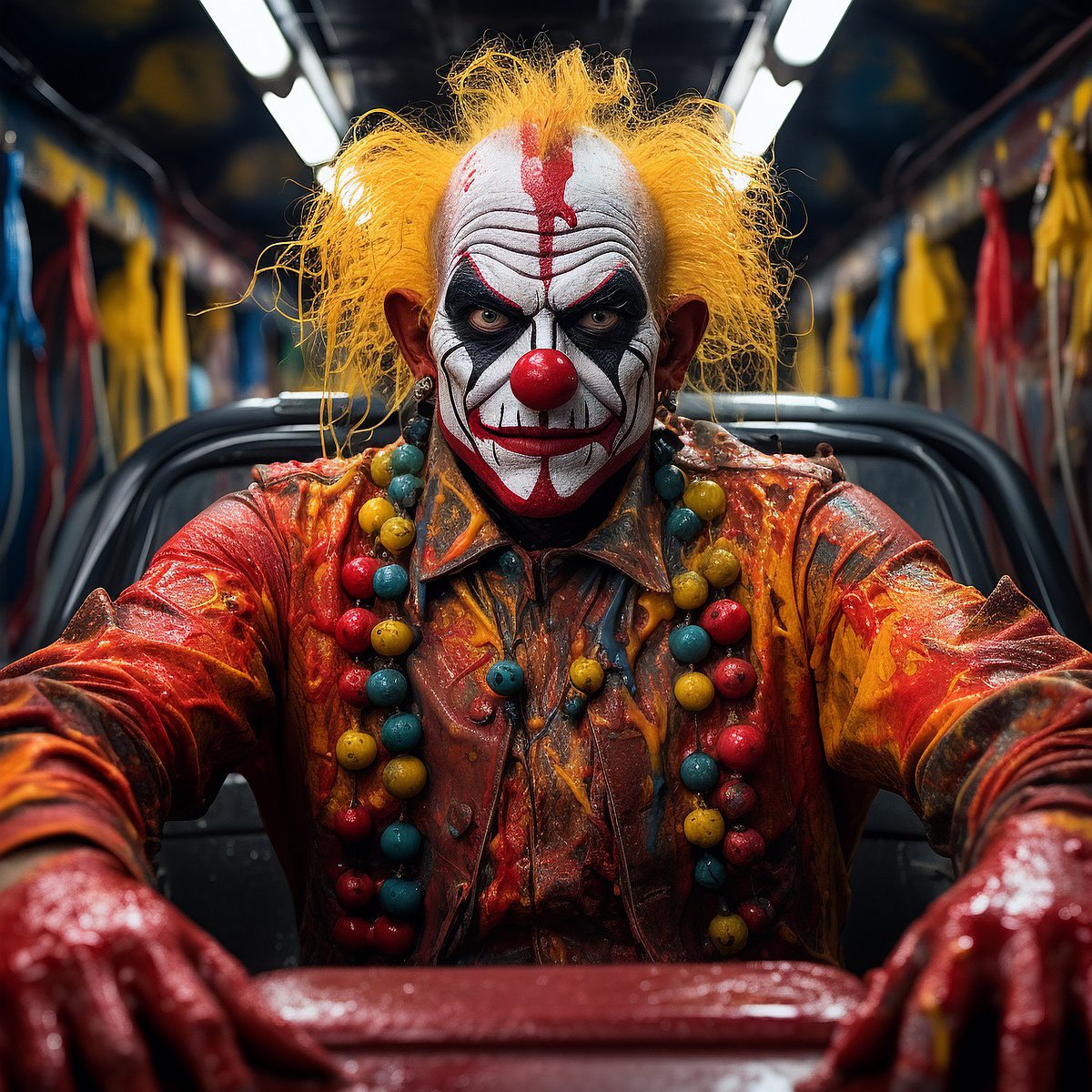 With an intense, straight-ahead glare, this menacing clown with a white face and red accents is definitely no nonsense. Covered in a thick, gooey gel, what has he been doing? And more importantly, what (or who) is he focusing on next!