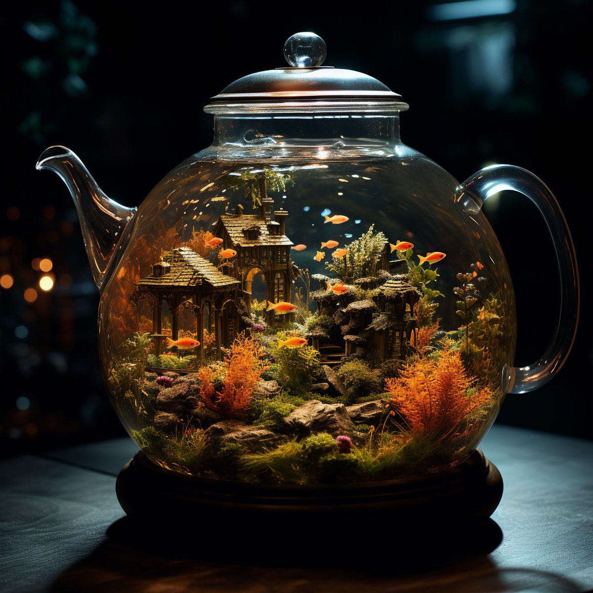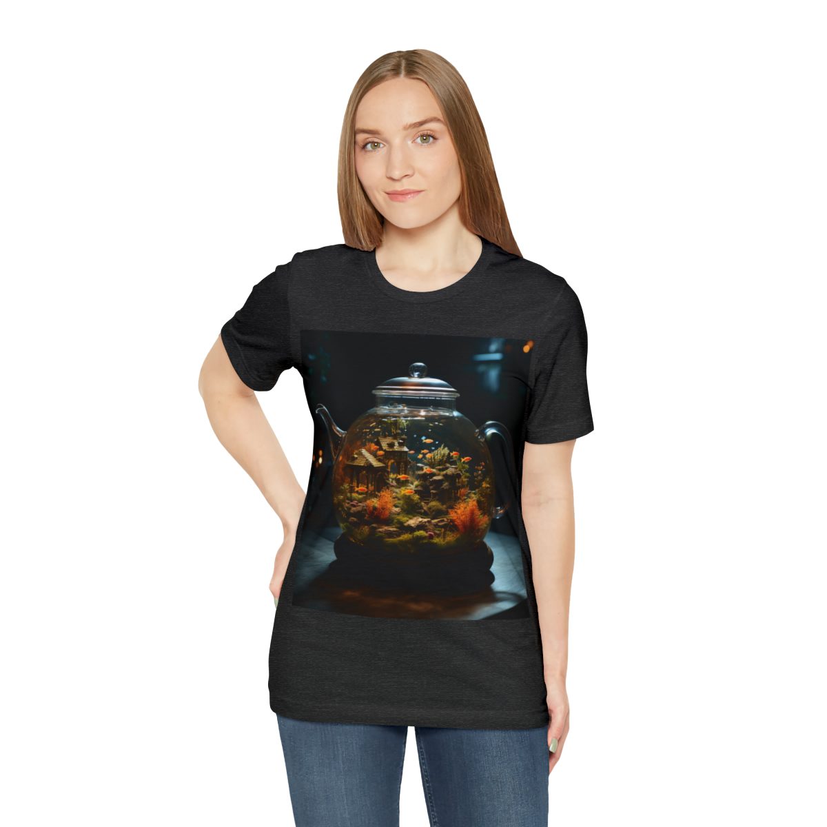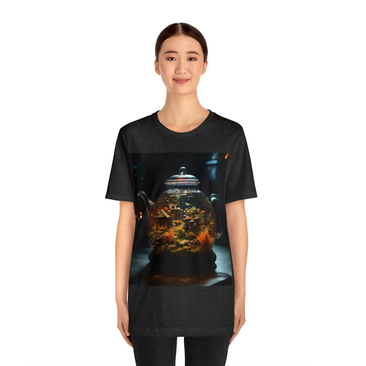 Dive into a world where teatime meets the deep sea! This ornate teapot isn’t for brewing — it’s a magical underwater realm, bursting with vibrant fish and lush greenery. But it’s not just about the aquatic wonders; every intricate structure and shimmering scale tells a tale of enchantment. With this shirt, you’ll be donning a whimsical wonderland. So, who’s up for a cup of imagination?