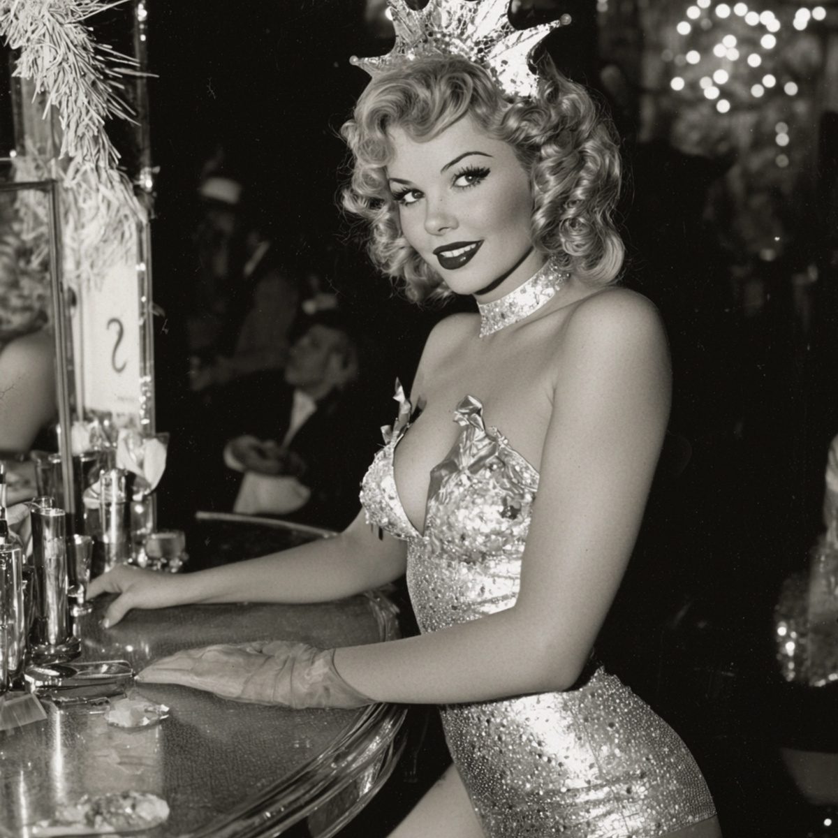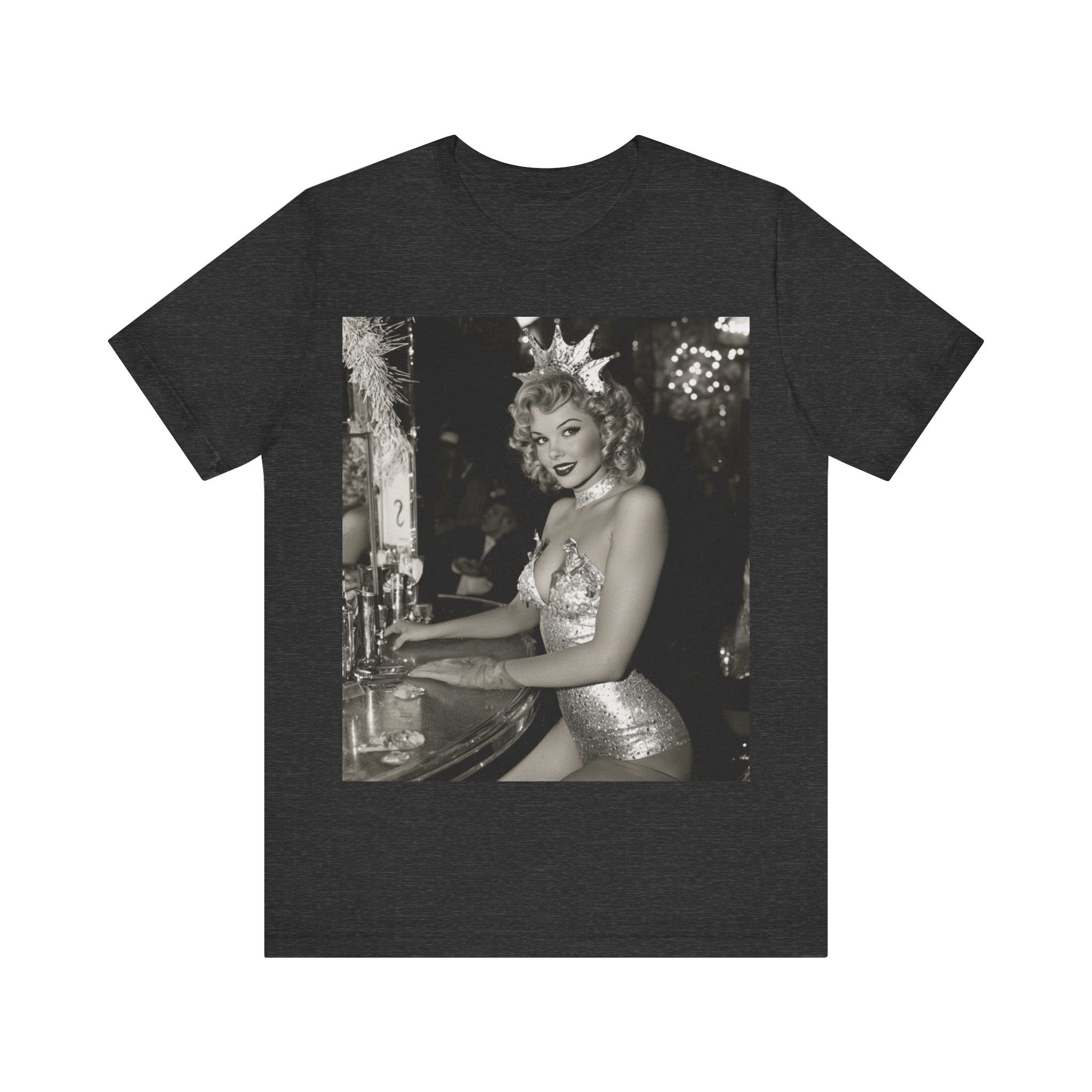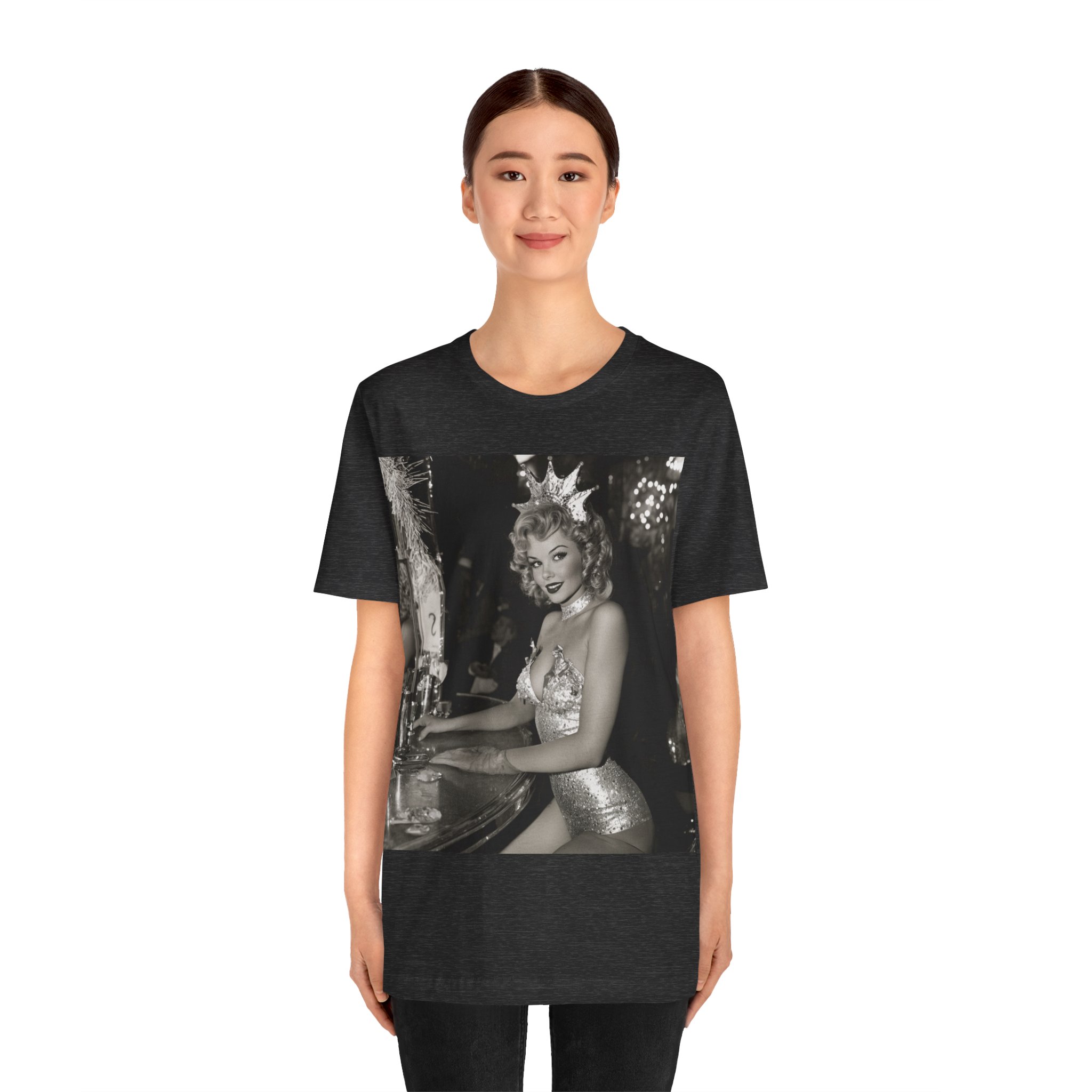 Step back into the golden era of glamour with this dazzling vintage showgirl crowned in sparkling style! This t-shirt captures the elegance and charm of retro nightlife. Perfect for fans of old Vegas, burlesque, and timeless sophistication, this eye-catching piece adds a touch of glittering nostalgia to any outfit. Wear it and shine like a star!
