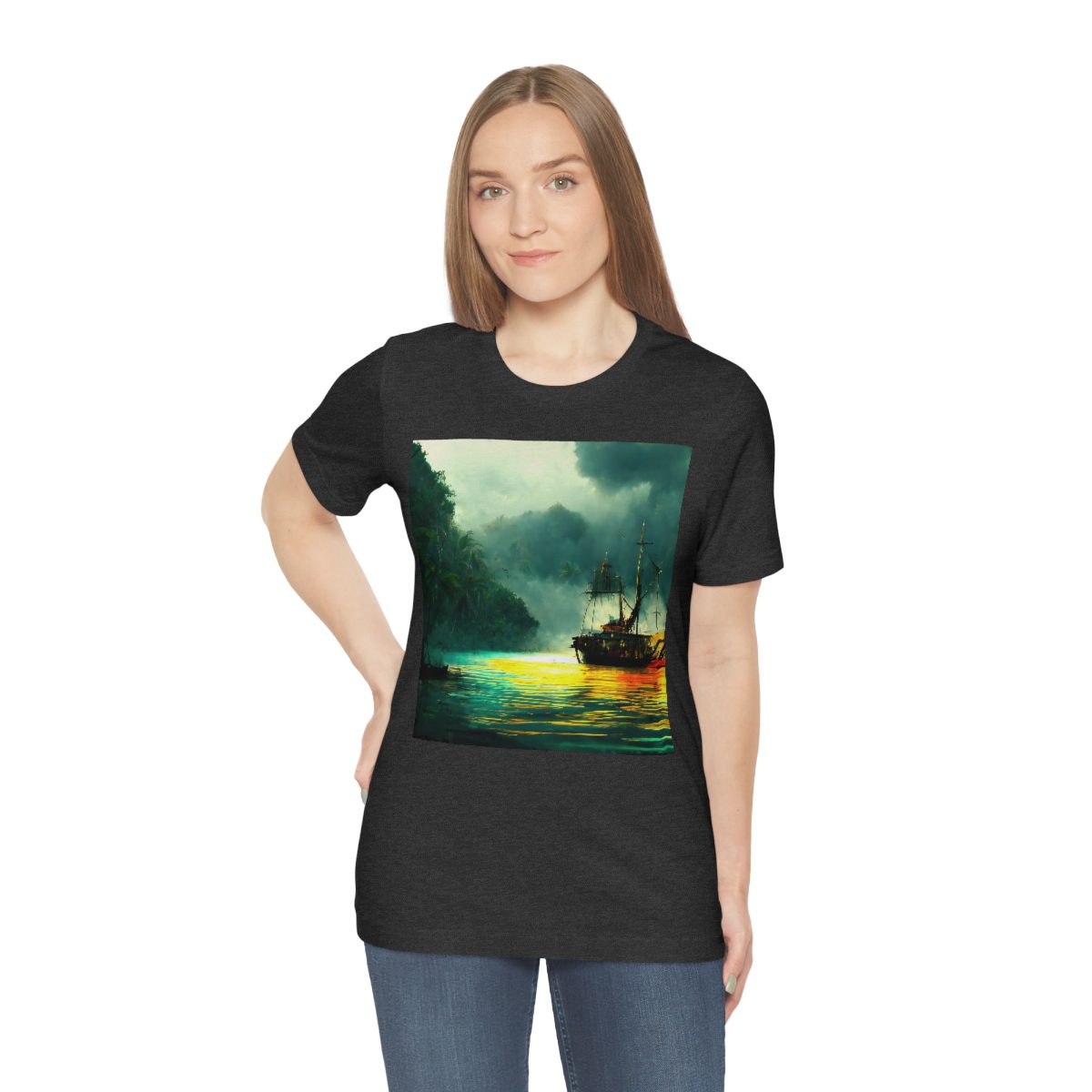 Wrecked Pirate Ship Sitting Tattered And Burned In The Bay With Dark Clouds At Sunset